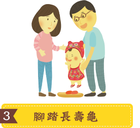 「一視二聽三抬頭,四握五抓六翻身,七坐八爬九發牙,十捏周歲獨站穩。」紅嬰仔出生滿週歲,古稱「度晬ㄗㄨㄟˋ」,當天外公外婆及親友送來賀禮,家裡準備牲禮、紅龜粿、雞酒祭拜神明祖先後,將紅龜粿送給親友分享喜悅。接著透過抓周禮俗慶祝紅嬰仔的第一個生日,首先讓紅嬰仔腳踩紅麵龜象徵健康長大、長命百歲,然後準備十二樣象徵不同行業的物品放置在米篩內,讓紅嬰仔從中抓取三物,此物特徵用來預測紅嬰仔未來職業或性向,同時也希望寶寶未來的成長過程都可以平平安安、順順利利。
