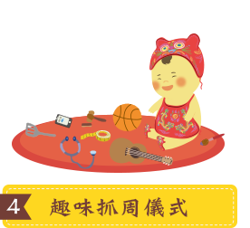 抓周,也叫試兒、試周。是每位寶貝人生中第一個重要儀式,因時代變遷,將抓周物品配合現今社會的職業,取十二樣代表不同職業的物品,寓意六六大順,來預測紅嬰仔未來職業或性向。